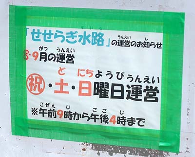 せせらぎ水路は8月と9月の祝日・土曜・日曜の9時から16時までです。