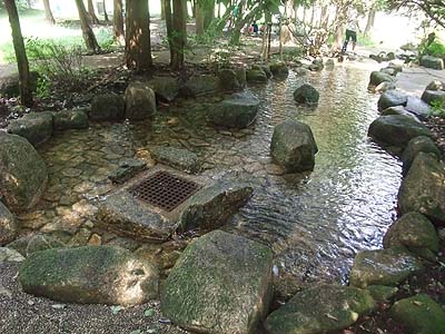 せせらぎ水路は石畳で、裸足ではいると足つぼマッサージが強烈です。