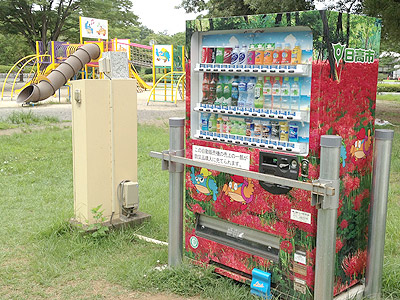この遊具の近くに日高市のマスコットキャラクターが描かれた自動販売機があり、非常にお世話になりました。