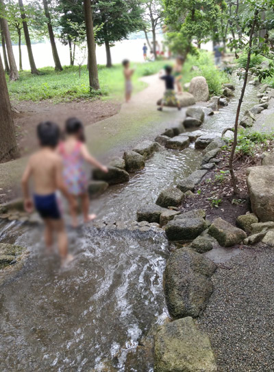 前回行ったときには、水遊びできる「せせらぎ水路」は8・9月の土日祝のみでしたが、変わったらしく、7月の日曜日である今日も水遊びができました。