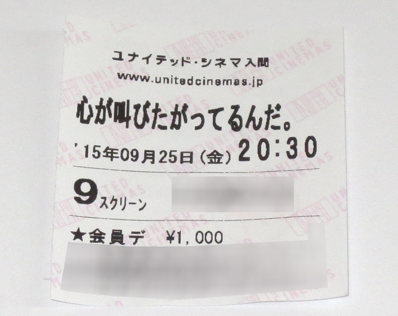 2015年9月25日に、アニメ映画「心が叫びたがってるんだ。」を観てきました。(劇場の会員なので1000円で)