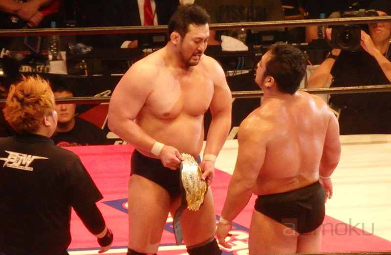 セミファイナルのBJW認定世界ストロングヘビー級選手権試合で鈴木秀樹vs関本大介の戦いは、男も惚れるくらい完璧な筋肉のぶつかり合いが特に迫力があってよかった。
