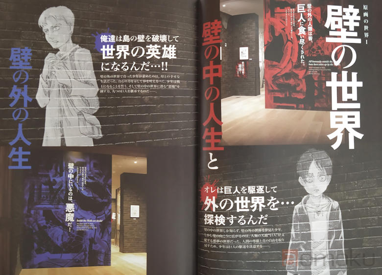 最終回を間近に控えた漫画作品『進撃の巨人』の生原稿展示をメインに、巨大スクリーンで迫力のある映像等、作品を体験してもらおうという趣旨の展示でした。