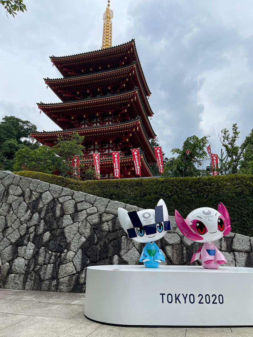 五重塔の手前に東京オリンピックのマスコットキャラクターがお出迎えしていくれています。