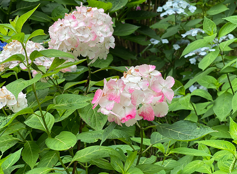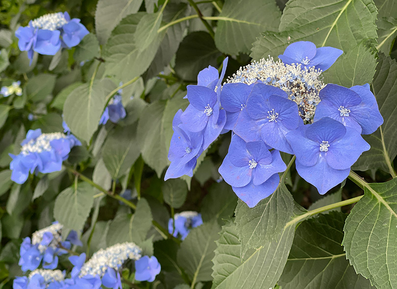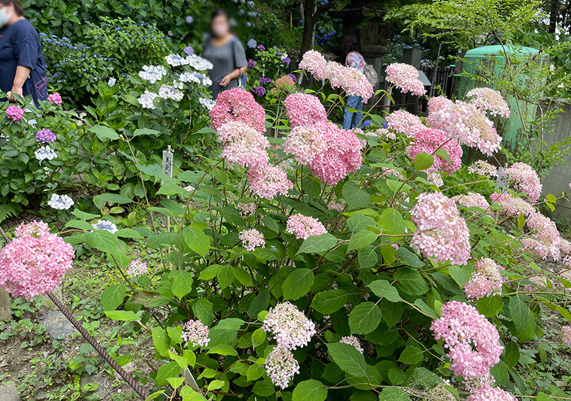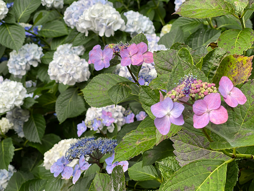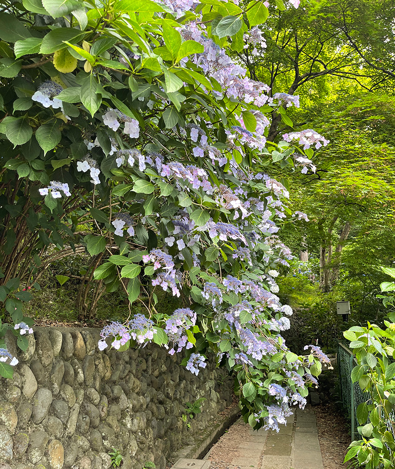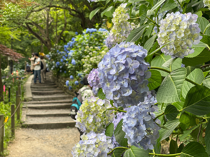 3人横一列がいっぱいとなるような細い道を進むと色鮮やかなあじさいをあちらこちらで楽しむことができます。