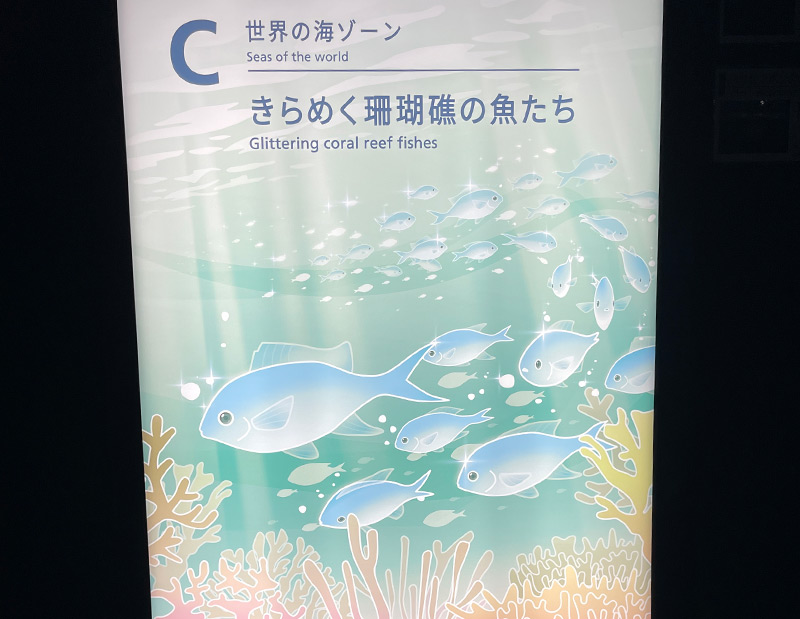 館内の展示ゾーンの標識は可愛らしい魚のイラストが描かれています。