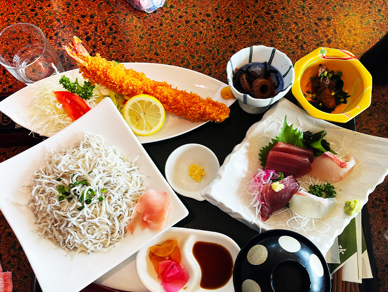 私が注文したのはA定食(2180円)で、釜揚げしらす丼、刺し身、エビフライなどのセットもの。