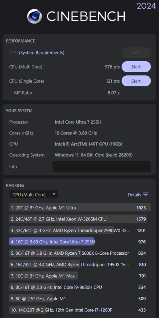 Intel Core Ultra 7 255H(16cires @ 3.69 GHz)の性能をCINEBENCH 2024で測定した結果、MultiCore 976pts、SingleCore 121ptsとなりました。