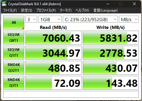 Read 7060.43MB/s、Write 5831.82MB/s。