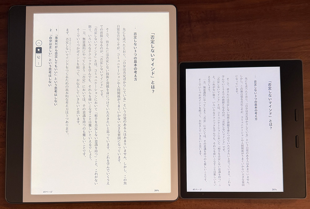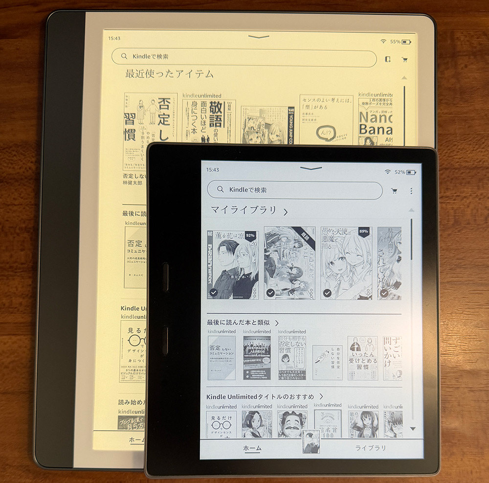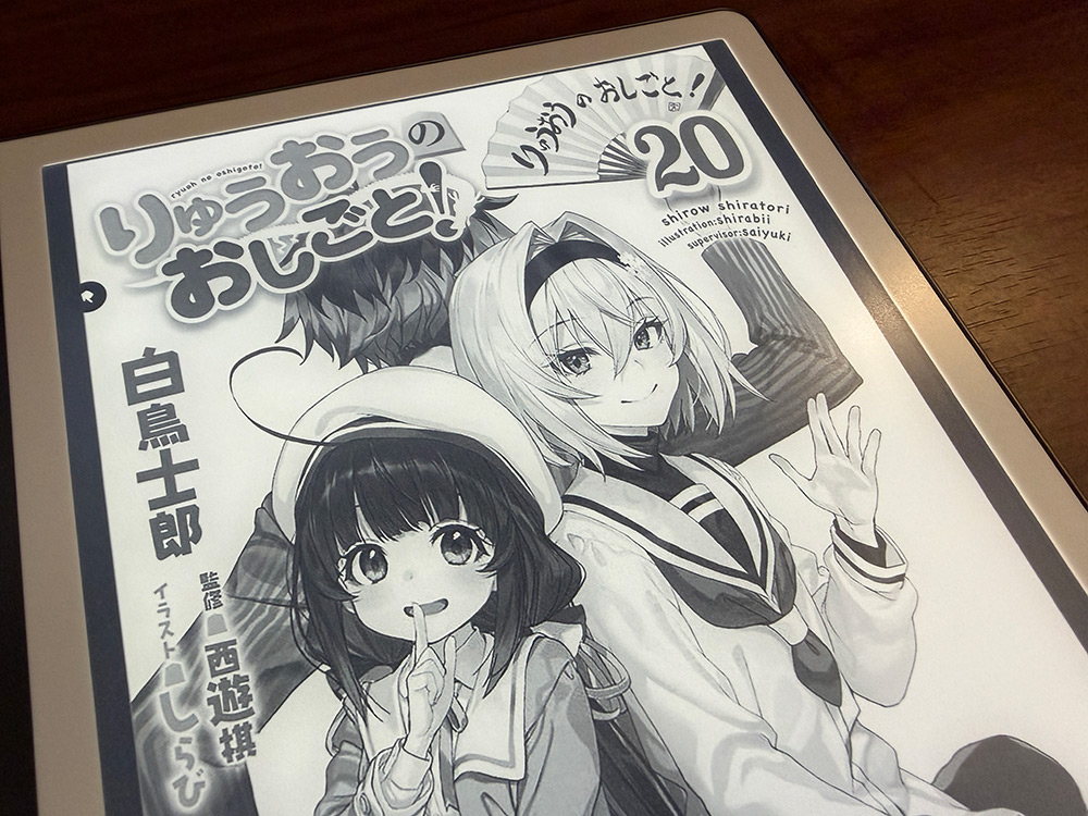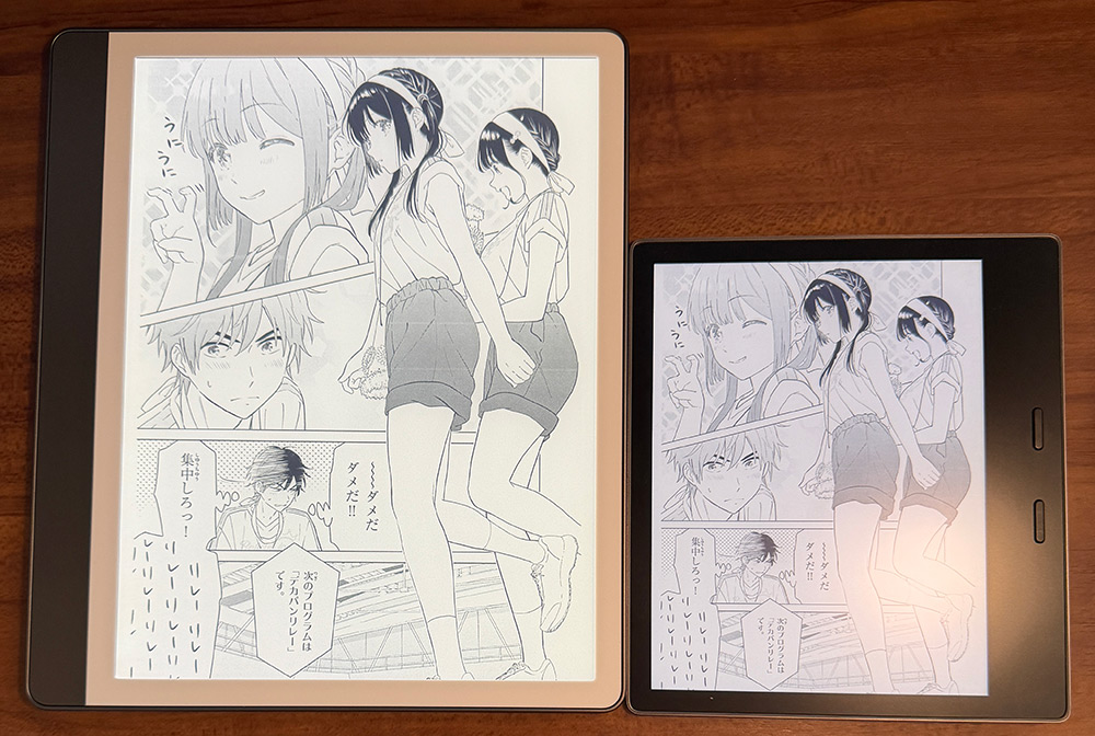 元の本がカラーの場合は淡くて薄いトーンで見づらいかもしれませんが、小説や白黒の漫画であれば、くっきりとした描写でとても見やすい。その上Kindle Oasisから乗り換えですが、画面が大きくて老眼でも安心してコミックが楽しめます。これに慣れると、ジャンプコミックスの紙の単行本サイズだと小さくて読めなくなるという弊害がありますけど(笑)