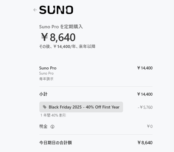 2025年11月27日、音楽生成AI『suno』がブラックフライデーセールで40%OFFとなっていました。