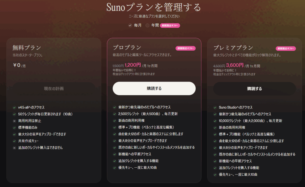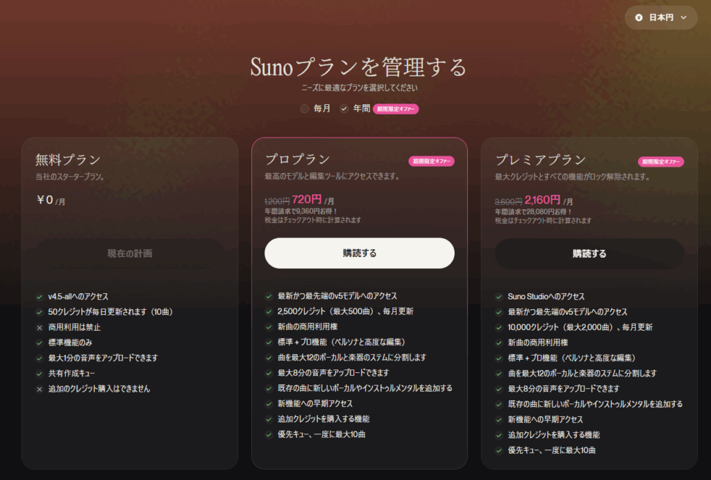 私はSuno Proを8,640円で年契約しました。