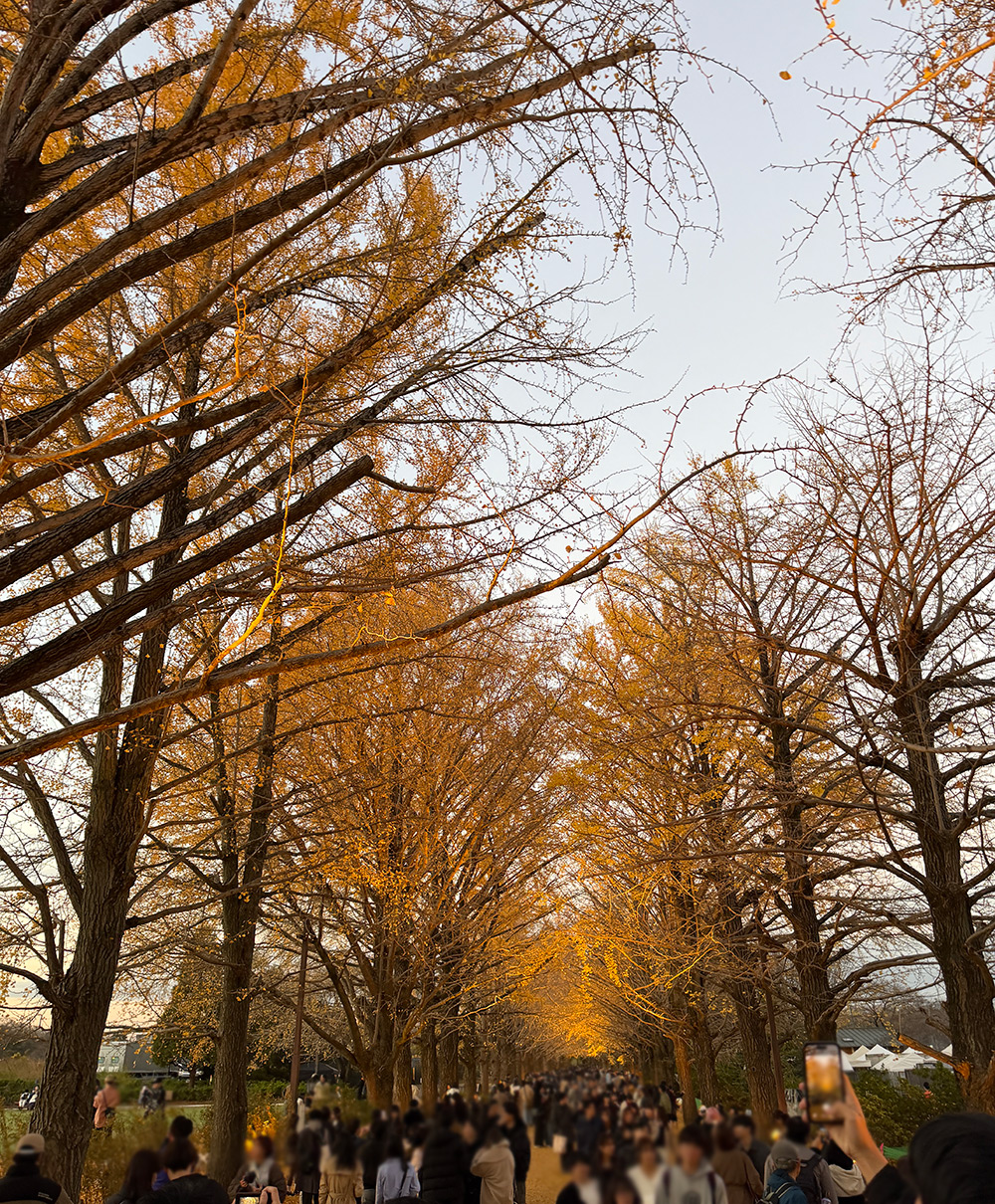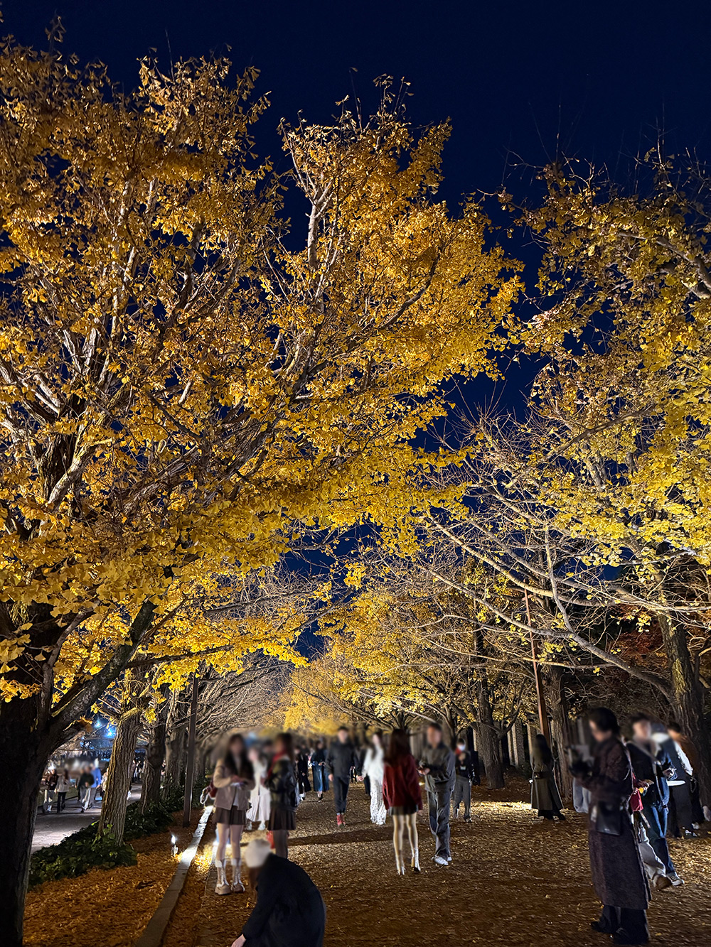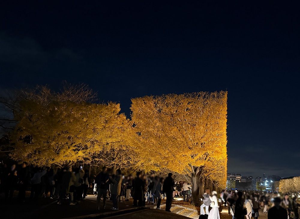 また、光と音楽が連動する演出では、イチョウ並木がリズミカルに、そして鮮やかに彩られます。変化していく空間をぜひお楽しみください。- イチョウ 98本