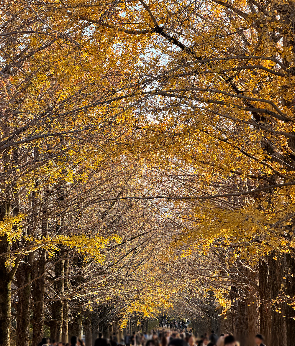秋の公園を代表する紅葉スポット「かたらいのイチョウ並木」は全長300mにもおよびます。自然樹形のイチョウが、頭上をおおうように枝を伸ばす素朴な美しさが魅力です。