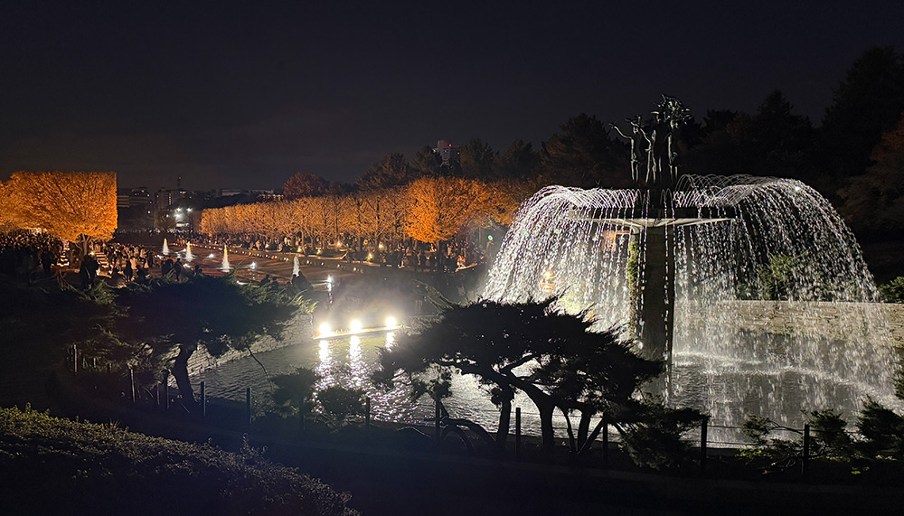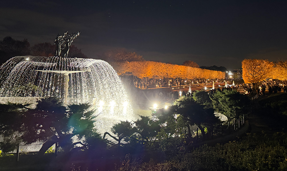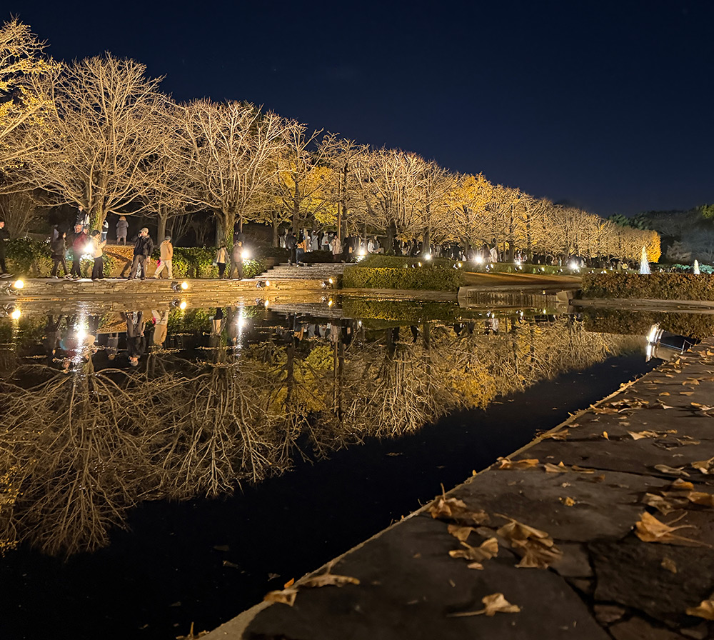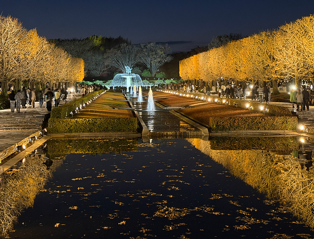 黄金に光輝くトンネル「かたらいのイチョウ並木」、水面に映る夜の庭園美「日本庭園」、そして今年はイチョウ・水路・噴水が織りなす幾何学的な美しい空間「カナール」が、ライトアップ会場として加わります。