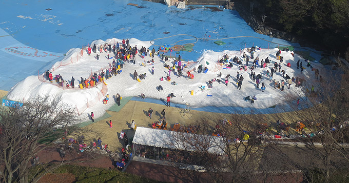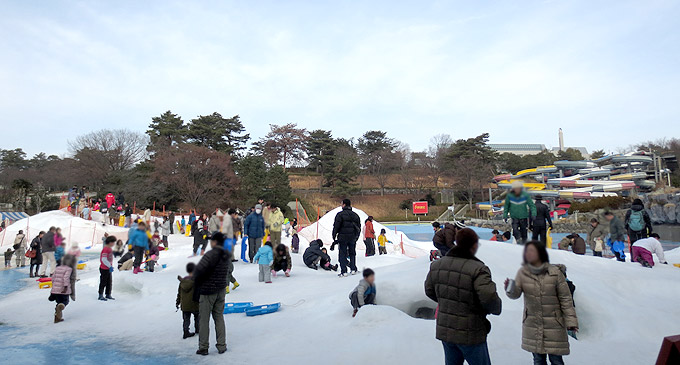 雪の王国はこんな感じです。手前で雪遊び、奥の山になっているところでそりができます。