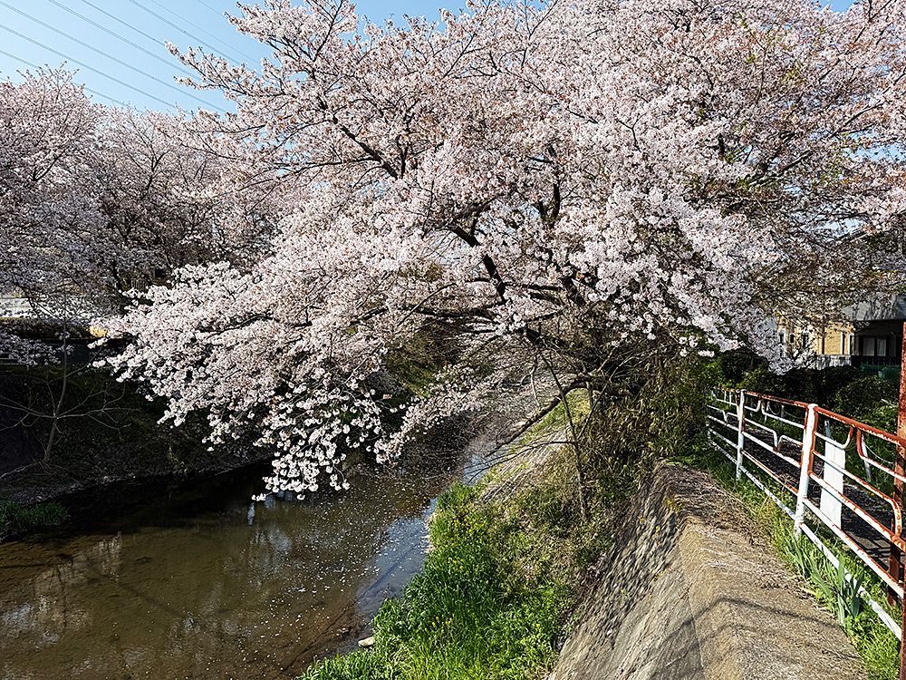 小さめの川と両岸に咲く桜がとても美しいので手持ちのiPhone 16 Proで撮影しました。