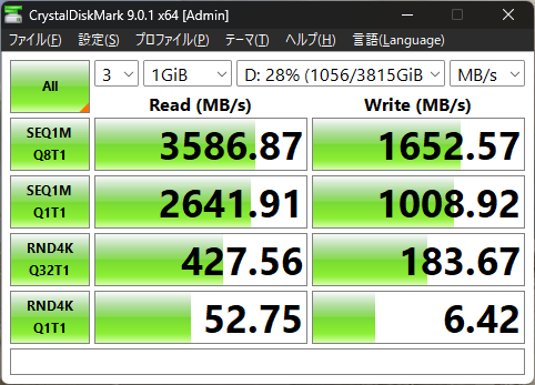 実際にThunderbolt 4端子に接続した結果、Read 3586.87MB/s、Write 1652.57MB/sと、十分な速度でデータの読み書きができたので、ストレスなくストレージ容量を増やすことができました。
